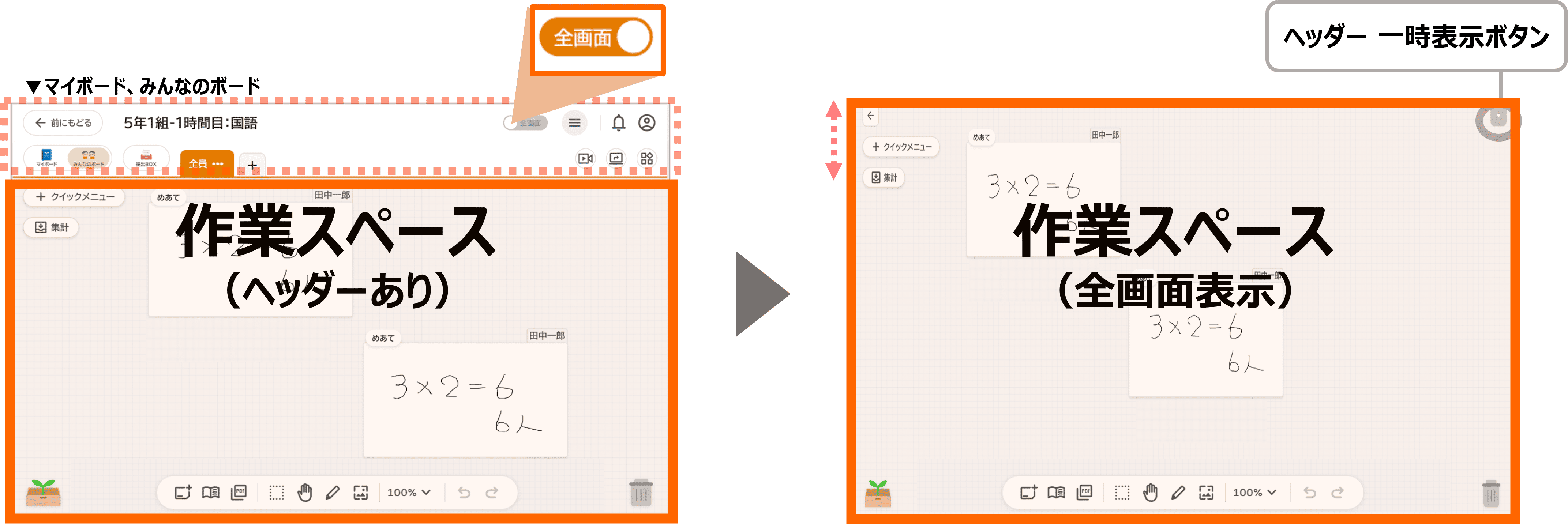 マイボード・みんなのボード・カード作成・提出BOXの画面で、「全画面表示」ができるようになりました。全画面表示ではヘッダーが非表示になり、画面上の作業スペースが広がるので、より作業しやすくなります。