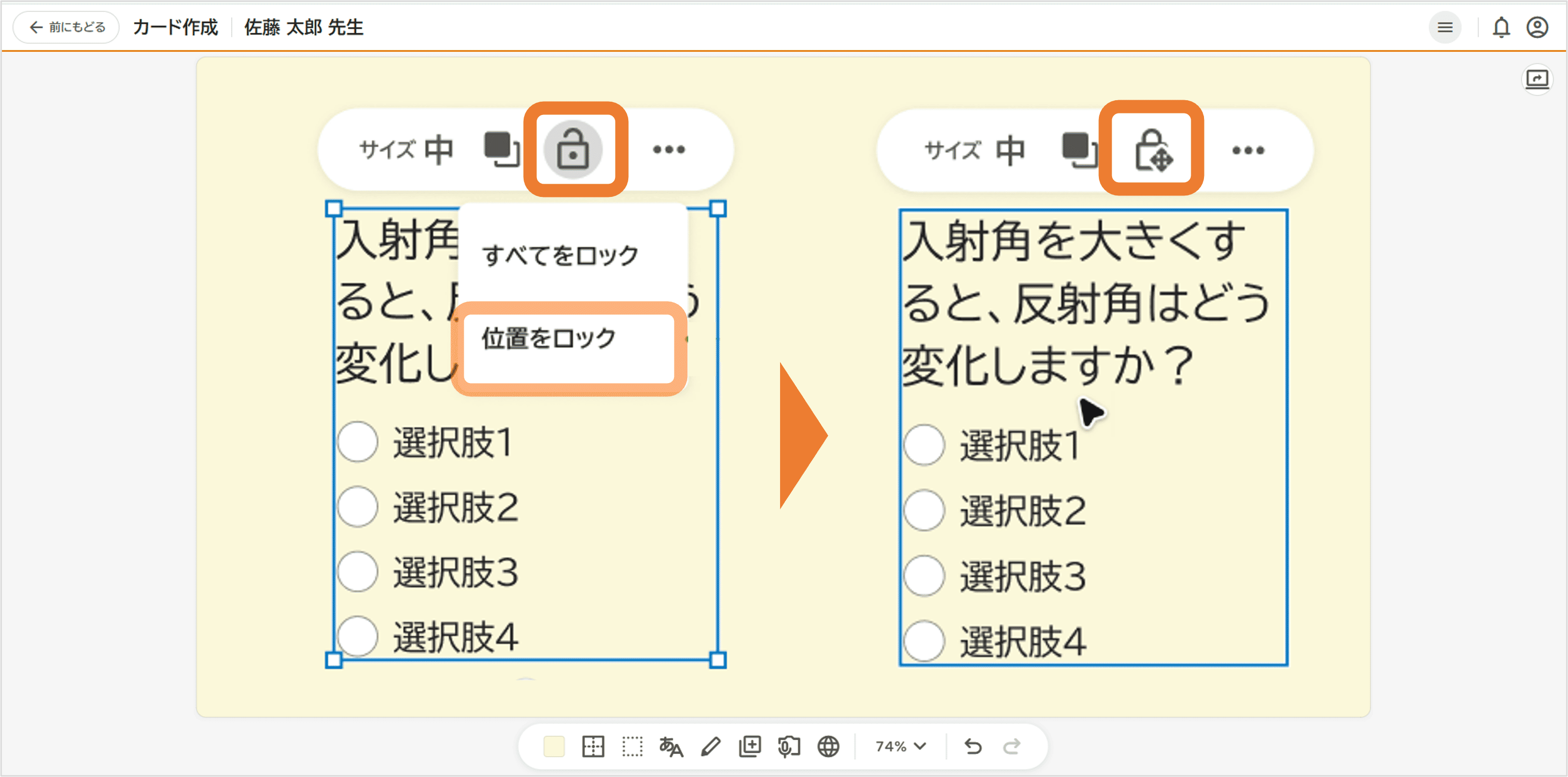 アイテムの操作ができなくなる「すべてをロック」 とは異なり、「位置をロック」はアイテムの位置のみを固定する機能のため、例えば先生が「位置をロック」の設定をした状態でも、子ども画面でアイテムの編集や選択肢の選択といったいつも通りの操作を行うことが可能です。