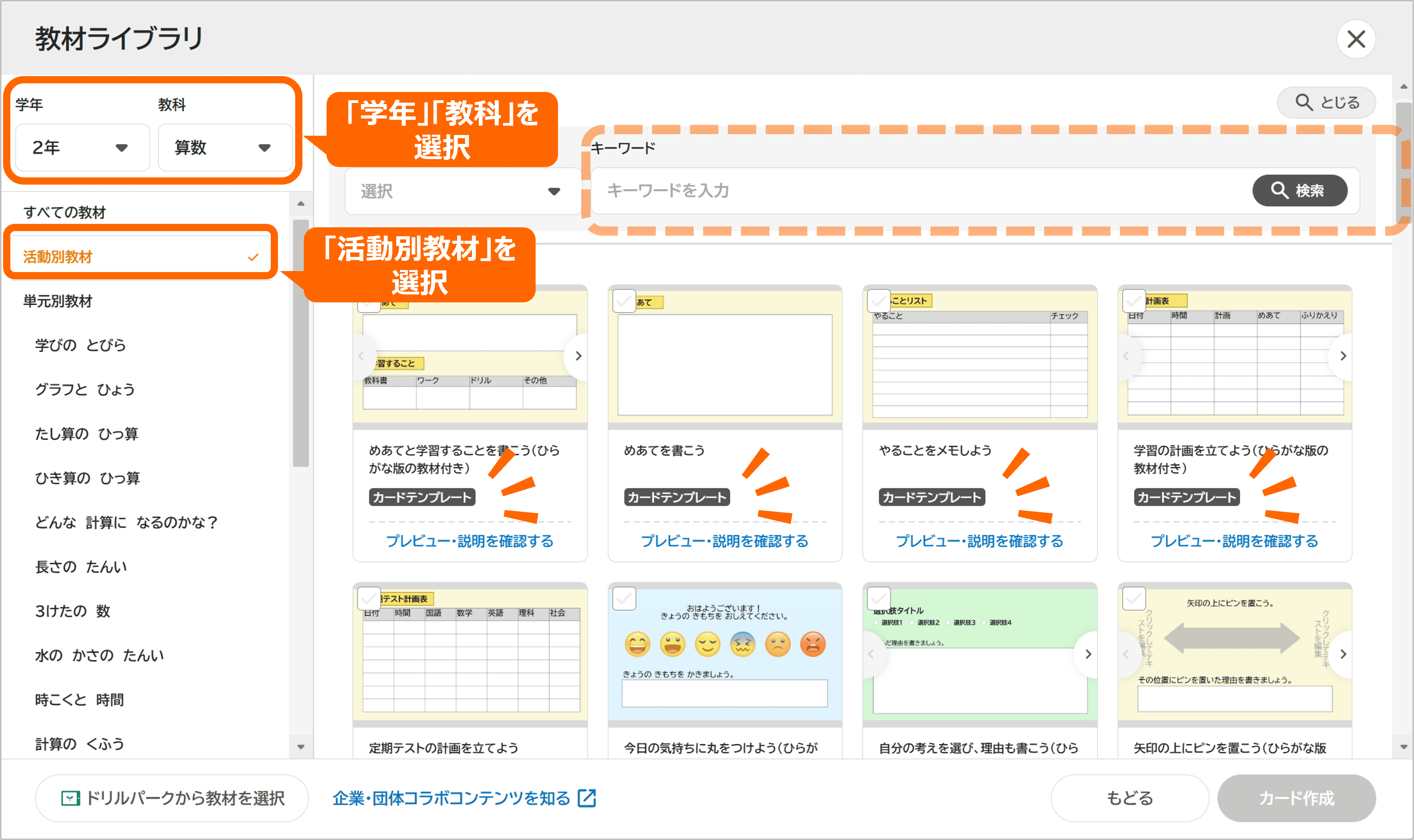 カードテンプレートを探したいときには、教材ライブラリ内で学年・教科を選択し、「活動別教材」を選ぶと一覧表示されます。