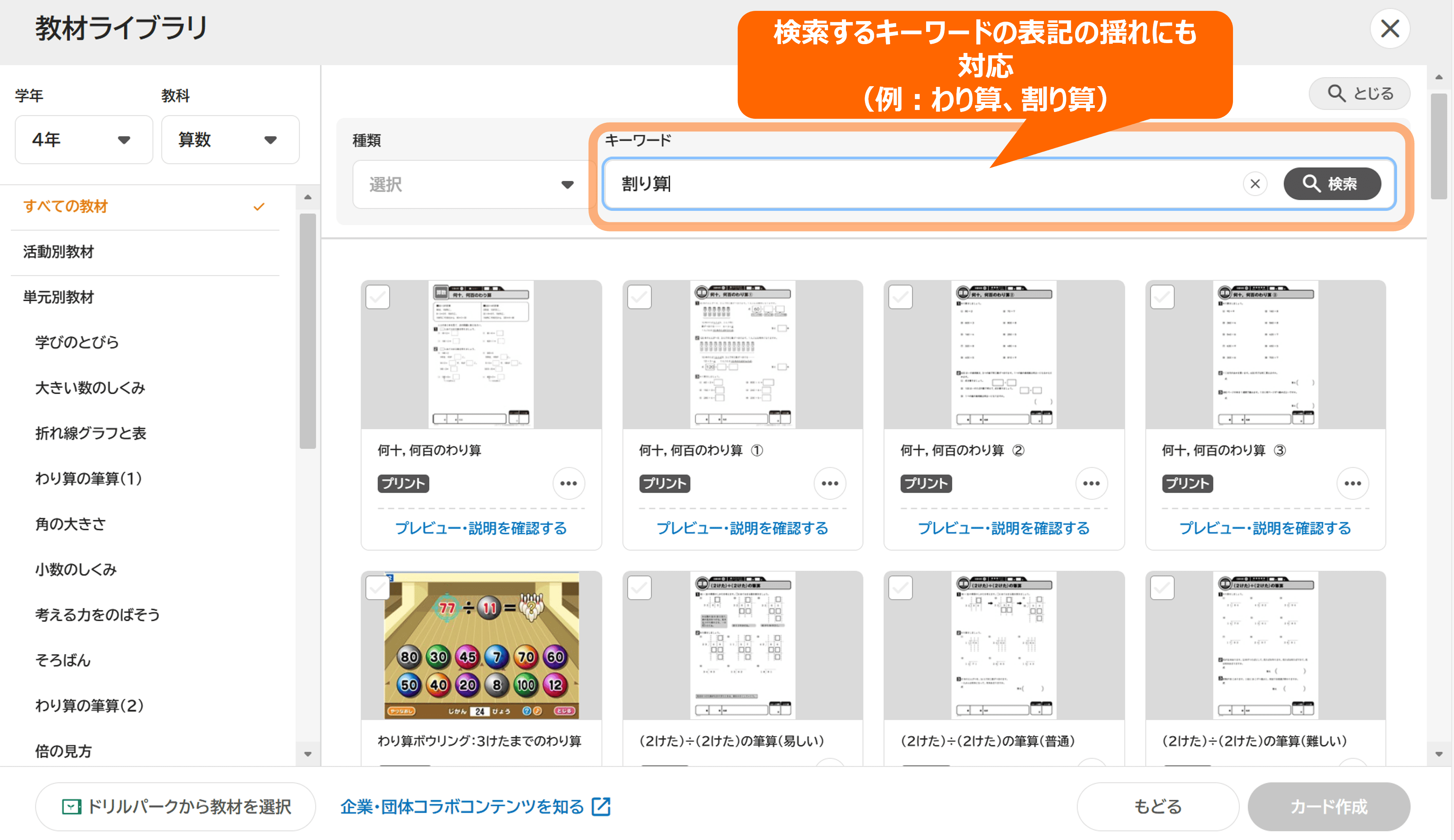 キーワード検索では、検索するキーワードに「わり算、割り算」のような表記の揺れがある場合にも、同一の検索結果が表示されるようになりました。