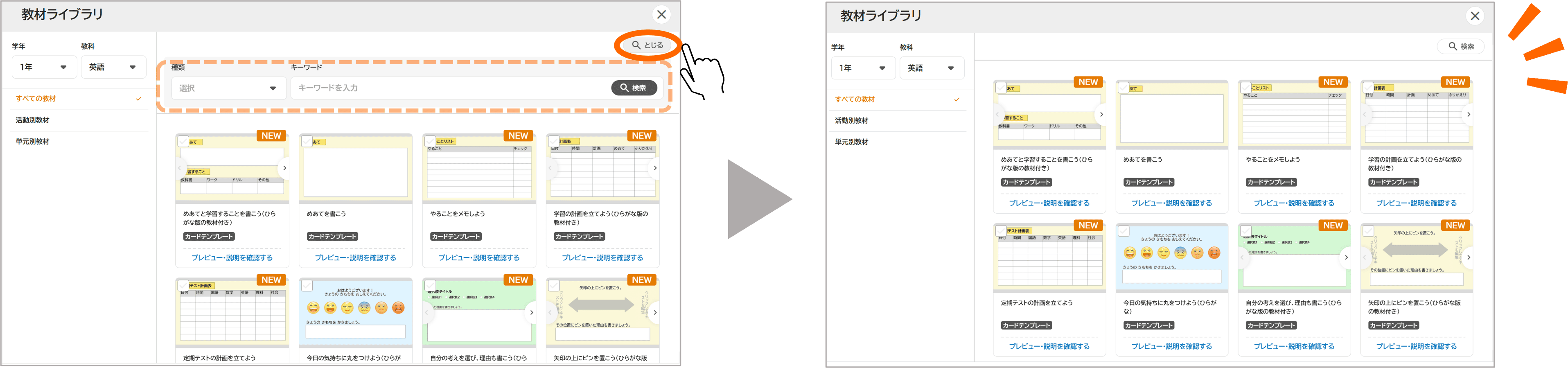 画面上部の「とじる」ボタンで検索バーを非表示にすることで、必要に応じて、教材一覧をより広いスペースに表示させることができるようになりました。