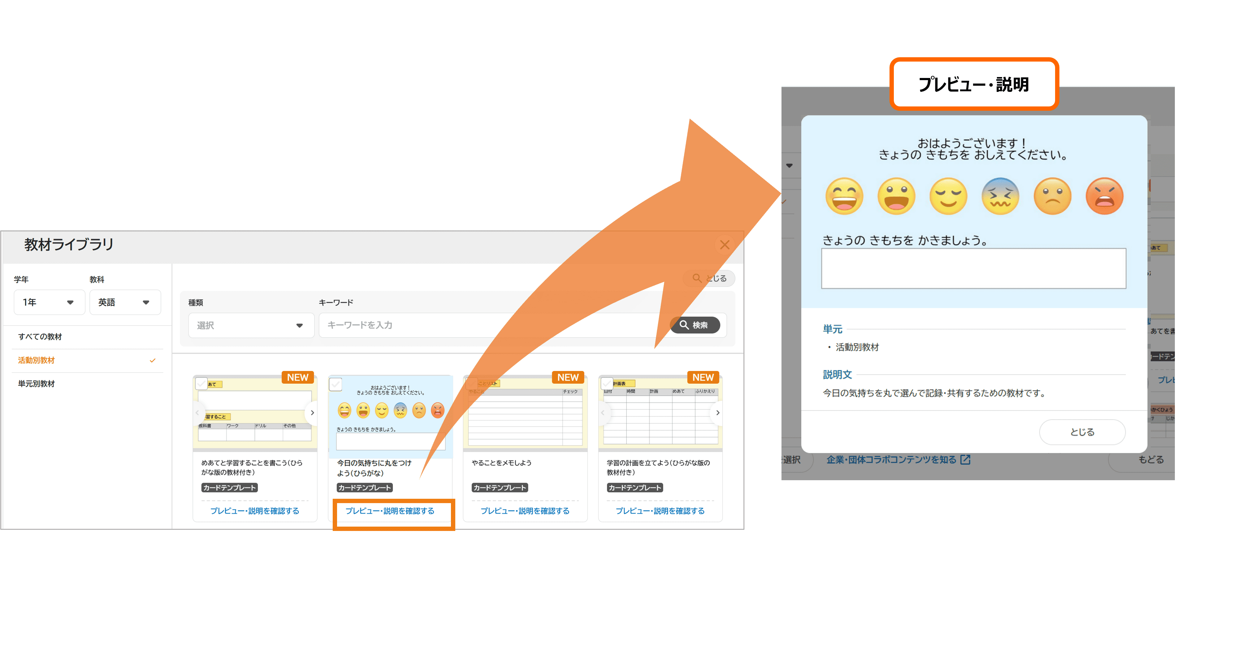 教材一覧で、各教材の「プレビュー・説明を確認する」ボタンから、教材の内容をすぐに確認することができるようになりました。