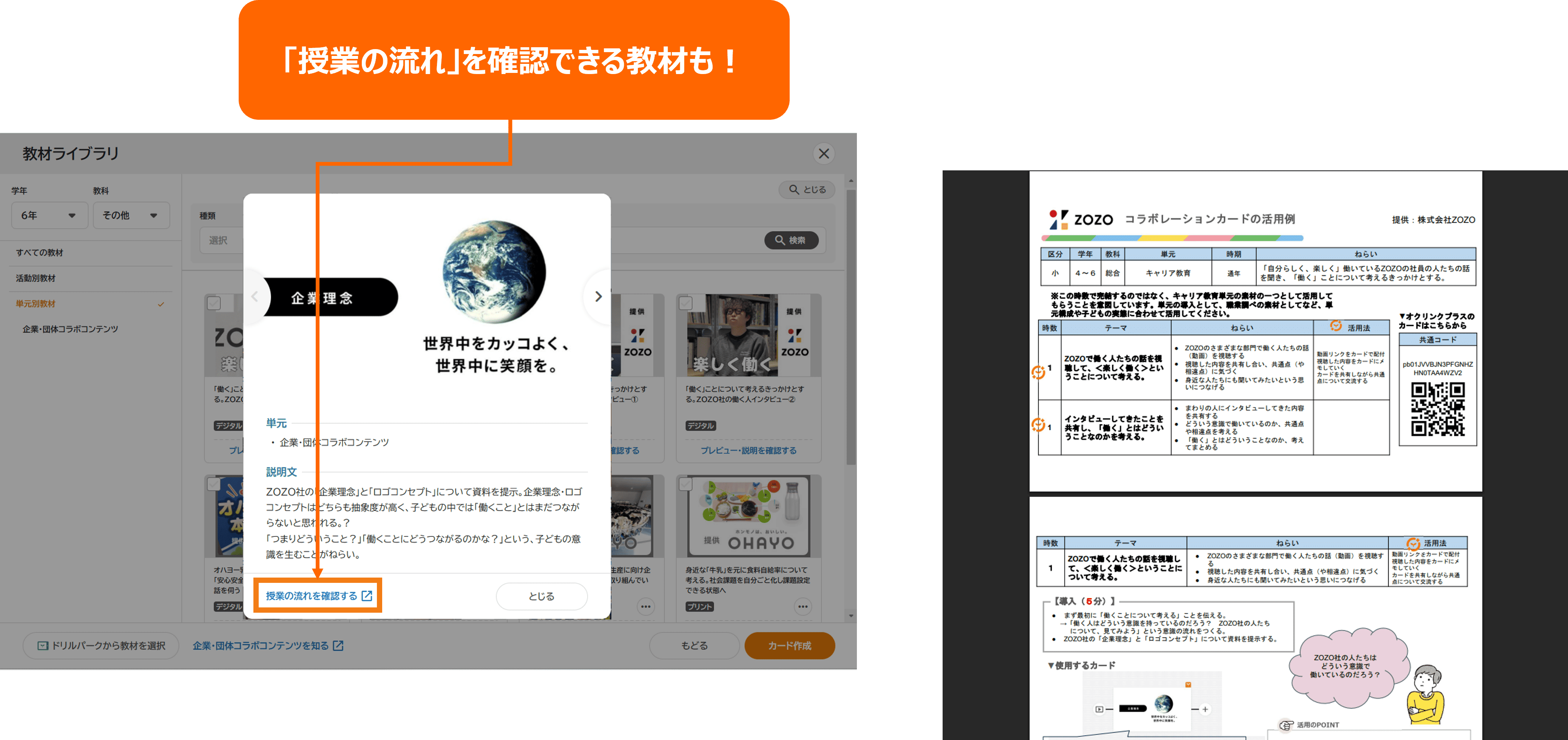 教材の中には「授業の流れ」が添付されるものもあり、授業での教材の使い方をすぐに確認できます。