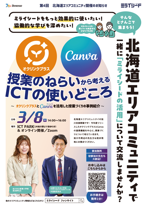 【内容】北海道エリアコミュニテイの旭川支部開催です!今年度リリースしたオクリンクプラスとCanvaの連携機能を中心に、授業づくりについて考えていきます。旭川市周辺の先生方は是非現地にお集まりください。