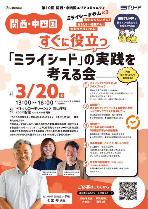 【内容】「子どもの学びをより深めるために、ミライシードをどう使うか」一緒に考えませんか?今回のエリアコミュニティは2名の先生の実践、講師の石堂 裕先生による各実践へのリフレクションにより、効果的なミライシードの活用方法や考え方を学ぶことができる会になっております。次年度の授業に生かせるヒントがたくさん詰まっておりますので、ぜひご参加ください!