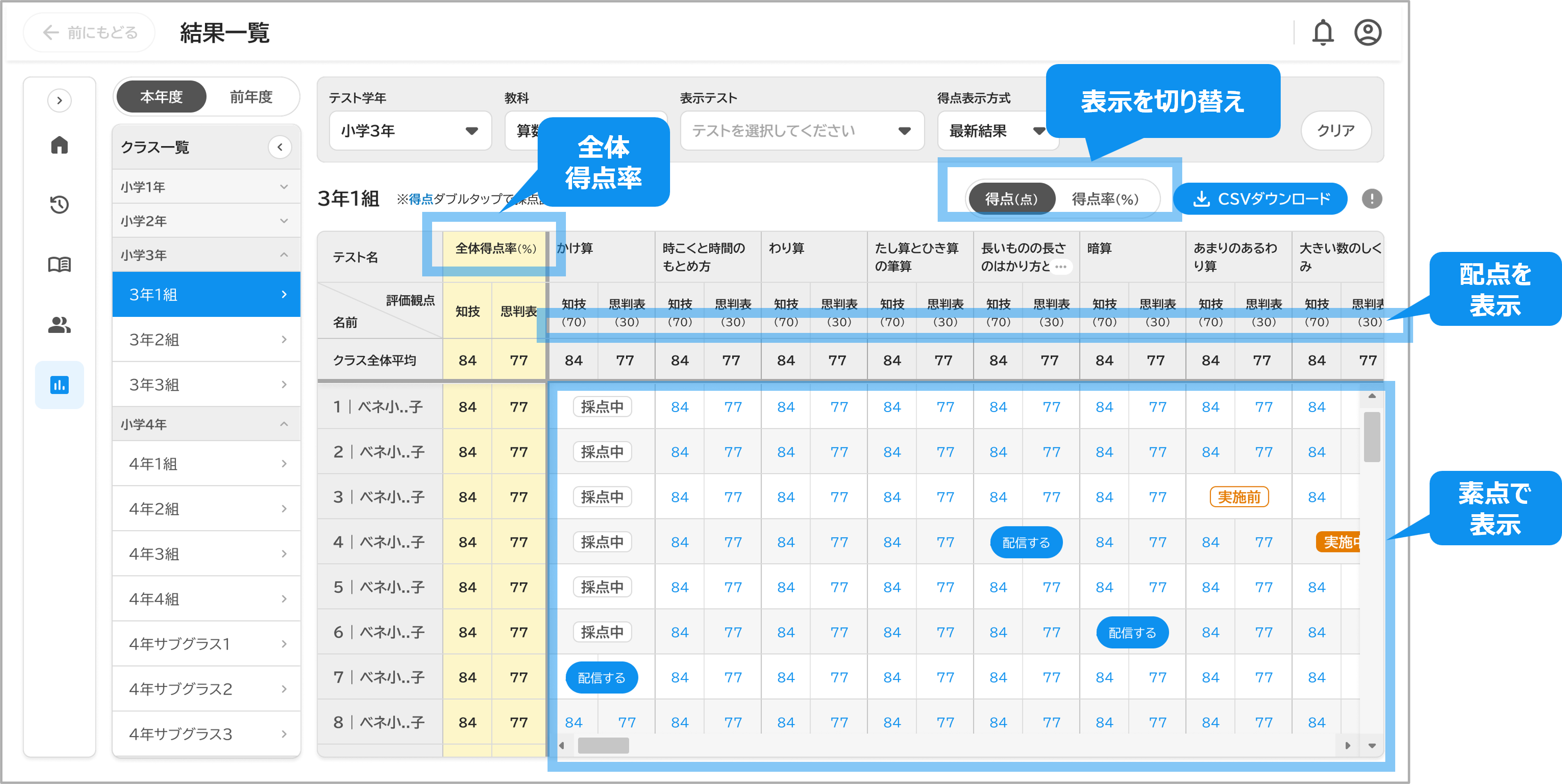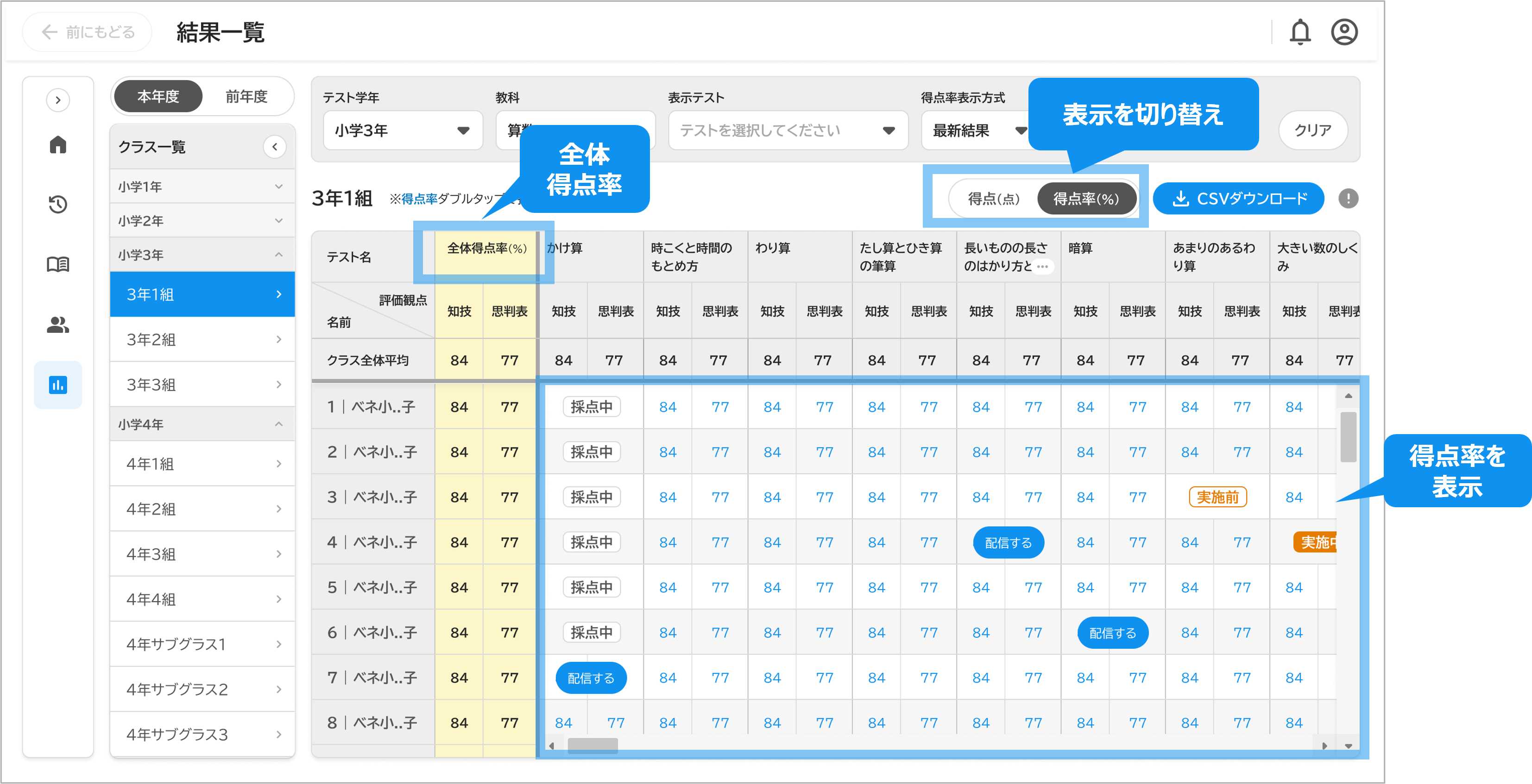 これまで結果一覧画面では、子どもの単元別・観点別の「得点率」の表示のみが可能でしたが、「得点」に切り替えて表示もできるようになります。データ出力の際には、得点・得点率の両方をそれぞれCSVファイルとしてダウンロードできます。