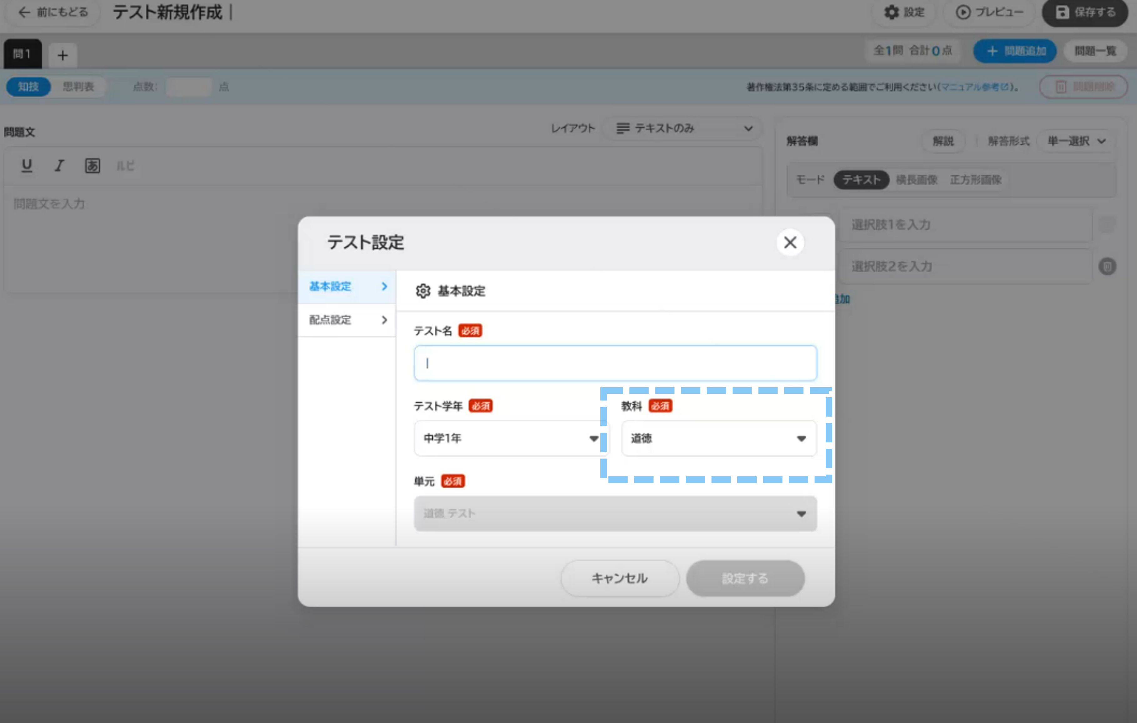 カスタムテスト作成機能について、実技教科や道徳、総合的な学習の時間など、5教科以外の教科でもテストの作成・配信が可能になります。
