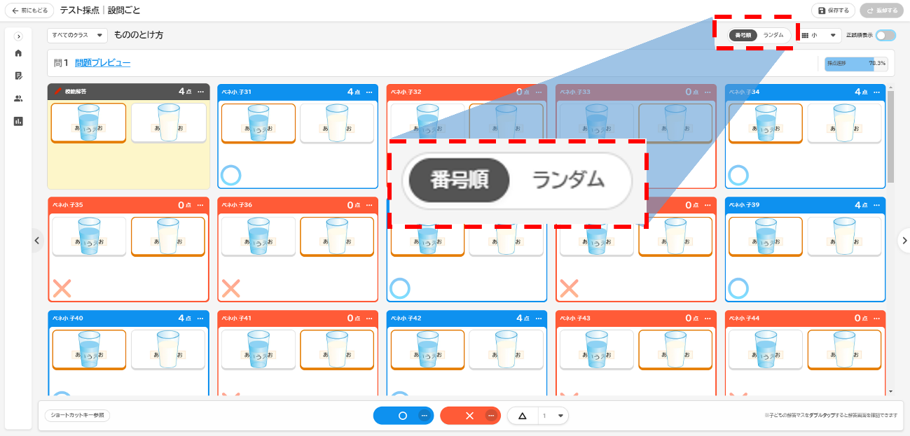 子どもたちの解答をランダム順に表示するとき、これまでは画面を切り替えるたびに設定がリセットされていましたが、今回のリリースでは、一度設定すれば、ログイン中は他の画面に移動してもランダム表示が保持されるようになります。
