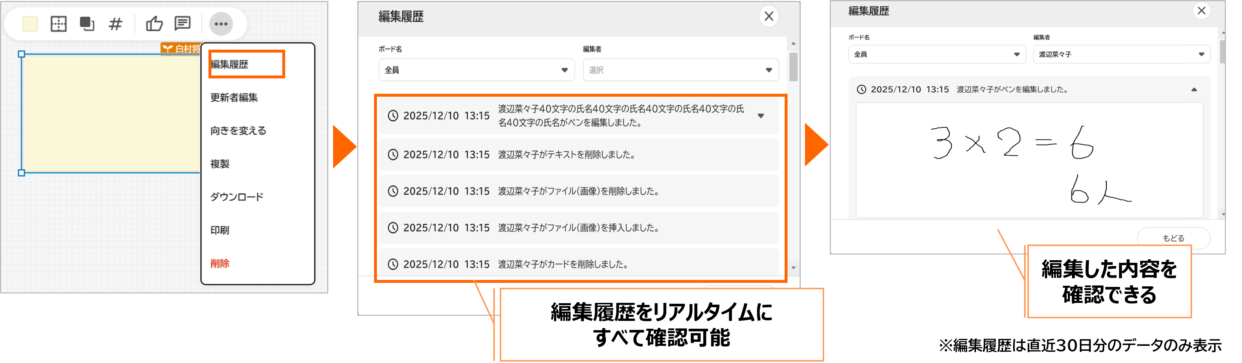 今回のリリースで、誰が・いつ・何を・どう操作したかがひと目でわかる「編集履歴」を搭載! これまではお問い合わせが必要だった、みんなのボードやカード上の編集履歴を先生ご自身ですぐ確認できるようになります。