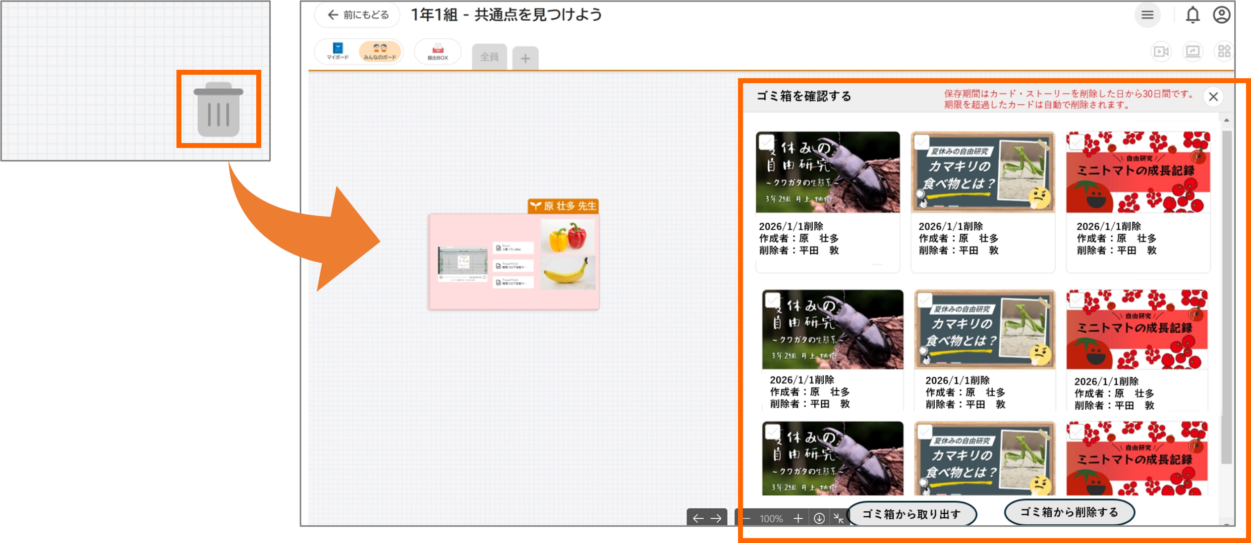※先生は全員のカードを復元・完全削除ができ、子どもは自分が削除したカードのみ復元できます。