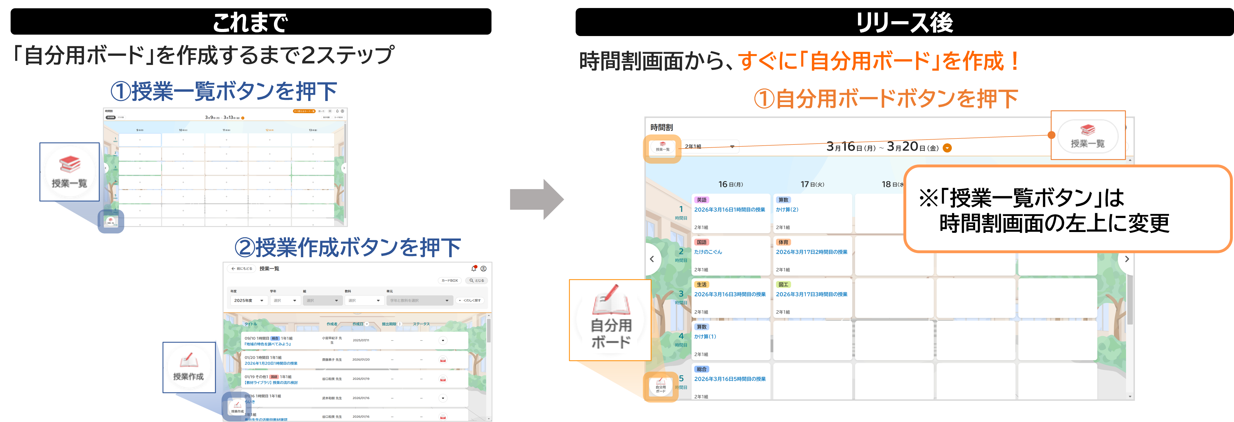 これまでは授業一覧画面にあった「自分用ボード」が、オクリンクプラスを開いてすぐの時間割画面から起動できるようになります。