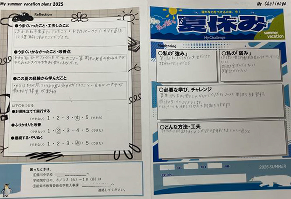 新潟県新潟市立濁川中学校は、自己調整を働かせる学習の推進として、夏休みの宿題を生徒自身が考える「マイチャレンジ」の取組に挑戦されました。