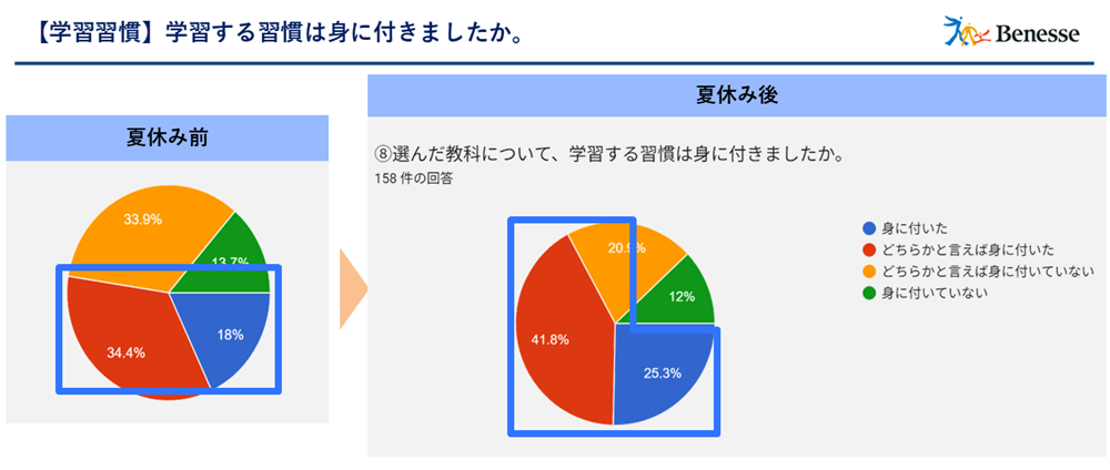 生徒様に取ったアンケートのデータ。今年度の取組を通じて、学習習慣が「身に付いた」子どもが約7%、「どちらかと言えば身に付いた」子どもが約7%増えた。