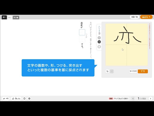 - 出題範囲を評価観点別に学力を測定する問題を搭載し、デジタルテストならではの機能(自動採点など)を拡充させることで、先生のテストにおける負荷軽減とともに、子どものテスト後の復習効果の最大化を図り、学力向上を支援します。