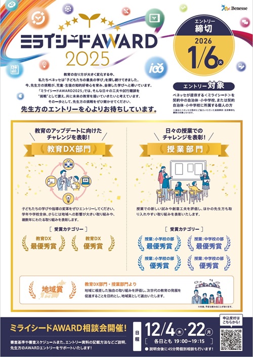ミライシードAWARD2025へのエントリーを検討中の先生方を対象に、応募のポイントや事例紹介、質問対応を行うオンライン相談会のアーカイブ動画を公開中!