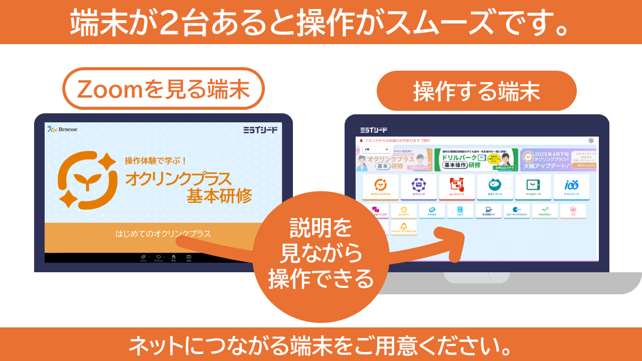 - 複数名で一斉に受講いただく場合は、Zoomの画面を投影する大画面を会場全体で一つ、ミライシード操作用端末は一人一台のご用意でご参加いただくことを推奨いたします。