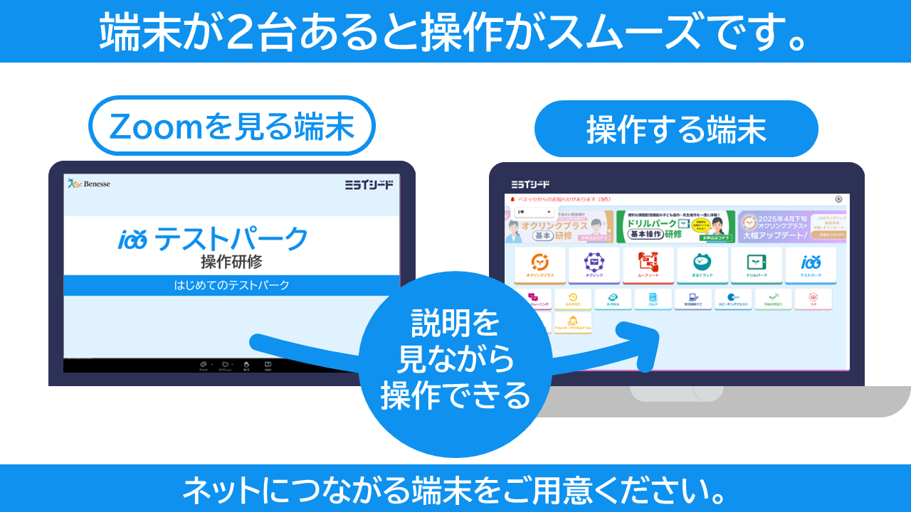 - 複数名で一斉に受講いただく場合は、Zoomの画面を投影する大画面を会場全体で一つ、ミライシード操作用端末は一人一台のご用意でご参加いただくことを推奨いたします。