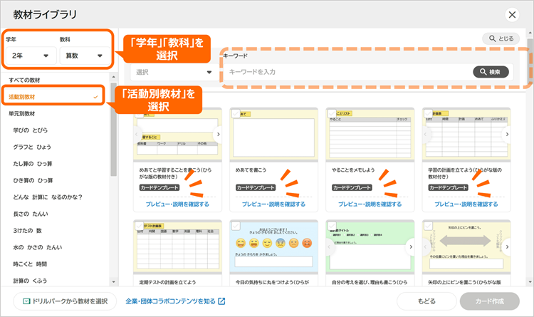 o学年・教科 → 「活動別教材」からカードテンプレートを探せる