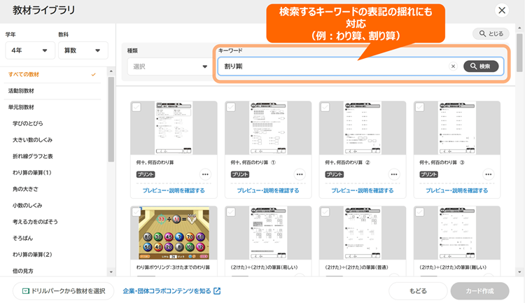 「わり算」「割り算」のように異なる表記でも同じ検索結果が表示されるようになり、入力に不慣れな先生もストレスなく検索できます。