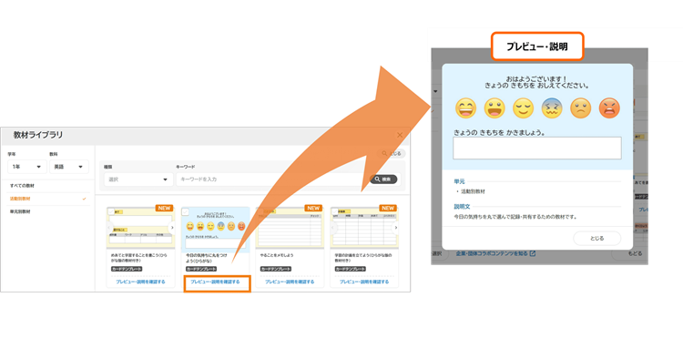 一覧画面の「プレビュー・説明を確認する」ボタンから、教材内容を即確認できるようになりました。