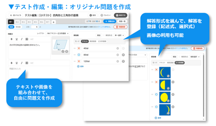 白紙から自由に問題作成ができるようになりました。配点・評価観点の設定や、問題形式・解答形式の選択、追加・削除・順番の変更も簡単にできてしまいます。