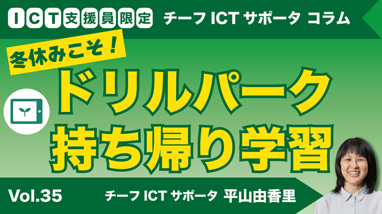 繰り返しになりますが、冬休みは、学習習慣を保ちつつ弱点補強ができる絶好のタイミングです。「ドリルパーク」の持ち帰りは、先生の宿題づくりの負担軽減にも、子どもたちの自律的な学びの育成にもつながります。ぜひ、冬休みに向けて、今から少しずつ持ち帰り準備を始めてみてください。