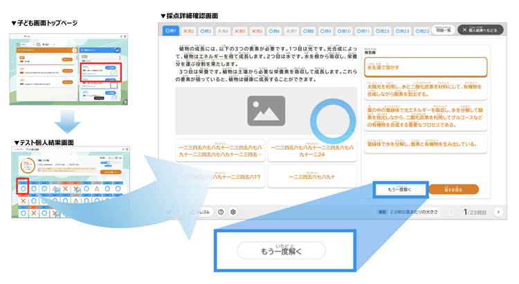 子どもは、返却されたテスト結果から解き直したい問題に移動し、「もう一度解く」ボタンを押すだけで解き直しができるようになりました。なお、テスト実施時の正誤に関わらず、返却済みのテストは全問解き直し可能です。