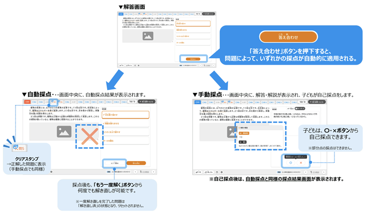 採点も「答え合わせ」ボタンを押すだけですぐに自動または手動で行われるため、操作に迷うことはありません。
