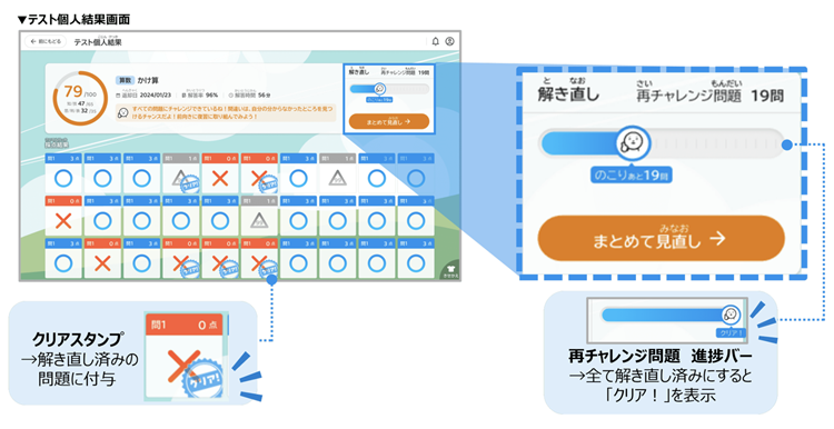 テスト実施時に△や×だった問題は、子どもの個人結果画面の右上に「再チャレンジ問題」として問題数が表示されます。再チャレンジ問題を解き直して正解すると、その問題は「解き直し済み」となり、進捗バーが更新されます。