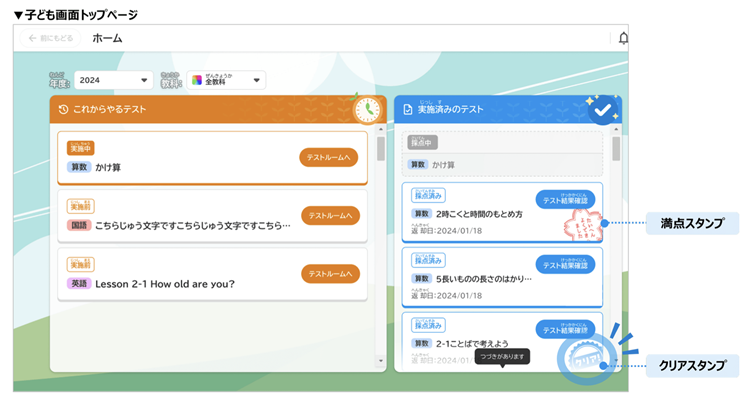 解き直し済みの問題には「クリア」スタンプが付与されるなど、子どもたちの学習意欲を高める仕掛けも用意しています。