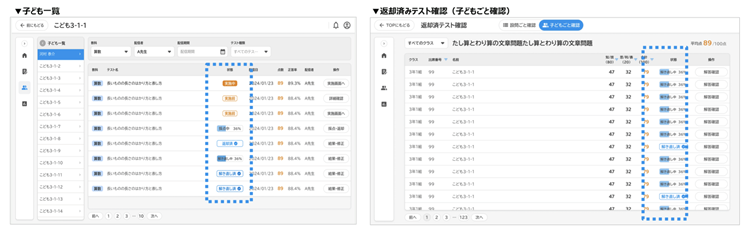 先生画面からも、子どもたちが「解き直し」をした履歴や進捗を確認できるので、子どもたちのがんばりを受け止め、個別指導や評価に生かすことができます。