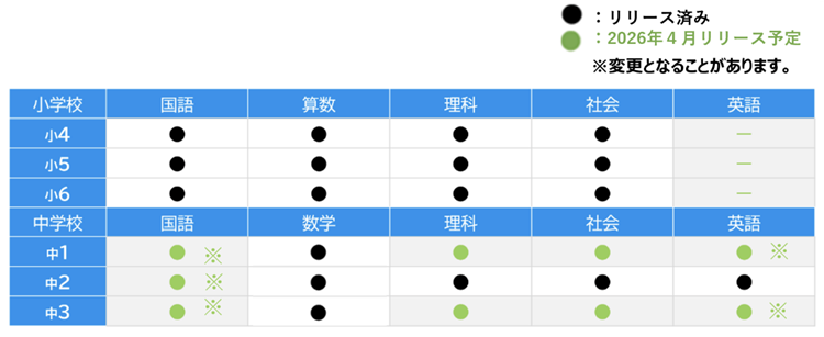 ※国語(中1~中3)・英語(中1・中3)については、学期ごとの順次リリースであり、全単元一括リリースではございません。現時点では、2学期分は2026年8月、3学期分は2026年12月のリリース予定です。
