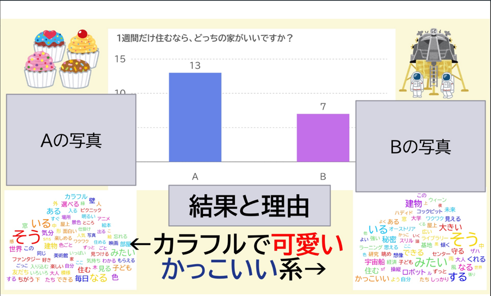 授業冒頭、オクリンクプラスで「1週間住むならどちらの家を選ぶ?」といった正解のない二択問題を提示。児童は直感で選び、その理由を入力。理由と言葉の集計から「かわいいから女子向け」「かっこいいから男子っぽい」といった無意識のジェンダー表象が浮かび上がります。この段階で、児童自身が「自分の感覚にはクセがある」と気付ける設計です。