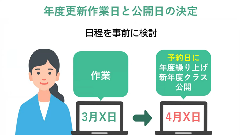 「システムの年度をひとつ繰り上げ、新年度のクラスや情報を整えて公開する作業」