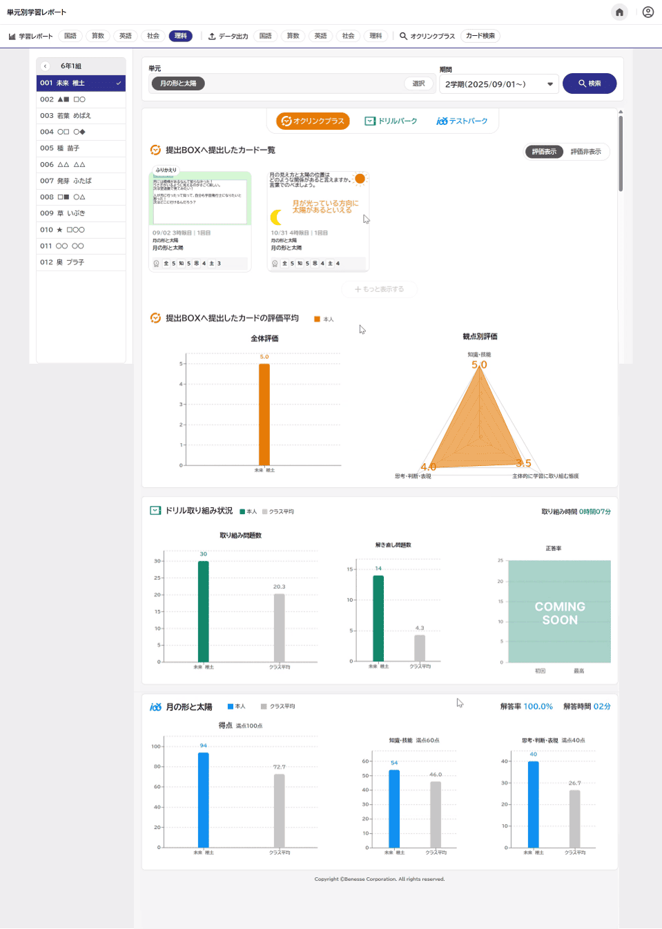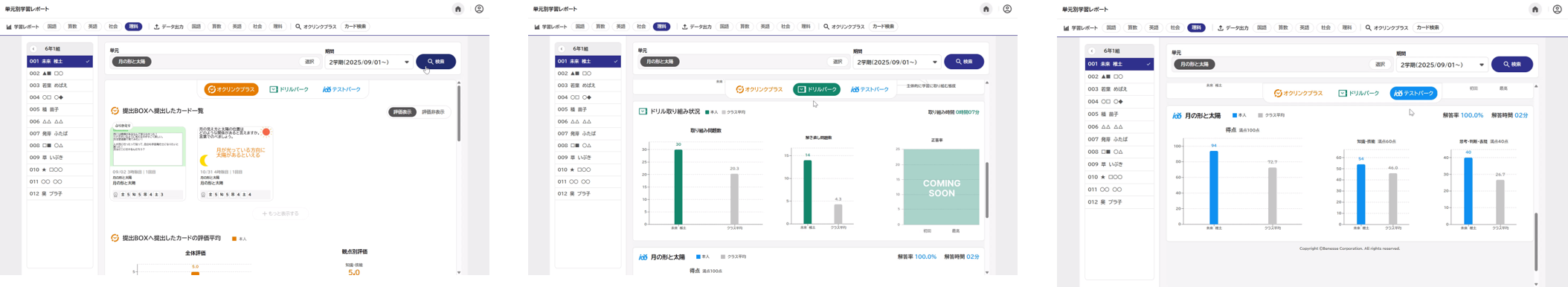 [学習レポート]で、選択した5教科でのオクリンクプラスで提出したカードと評価、ドリルパークでの取り組み状況やテストパークの結果などをもとに、単元ごとの評価や指導に活かします。