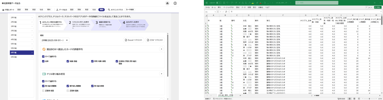 クラス・教科・期間を絞って、ExcelまたはCSVリクエストをタップして出力できます。