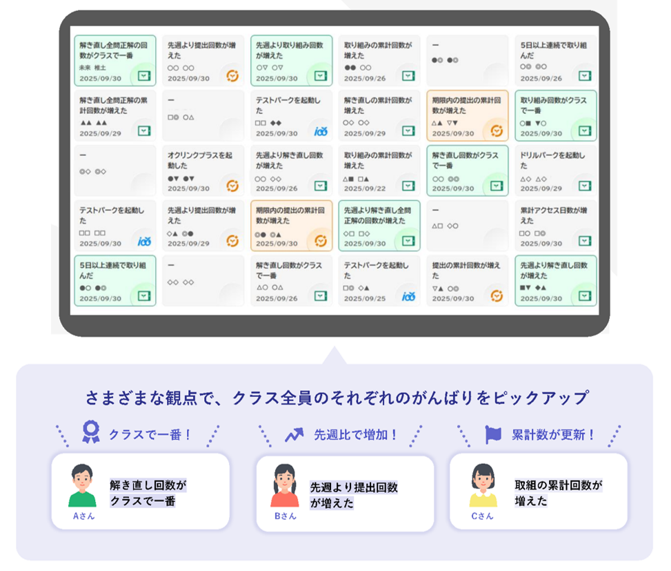 学習データだけでなく、子どものがんばりをピックアップ。過去10日間のがんばりの中で、一番新しい記録が「毎日」更新され、一覧で表示されます。 特に注目してほしい子どものがんばりが自動でピックアップされるので、子どもたちの小さな変化や地道ながんばりを把握し、毎日の声かけに活かすことができます。