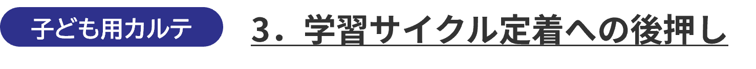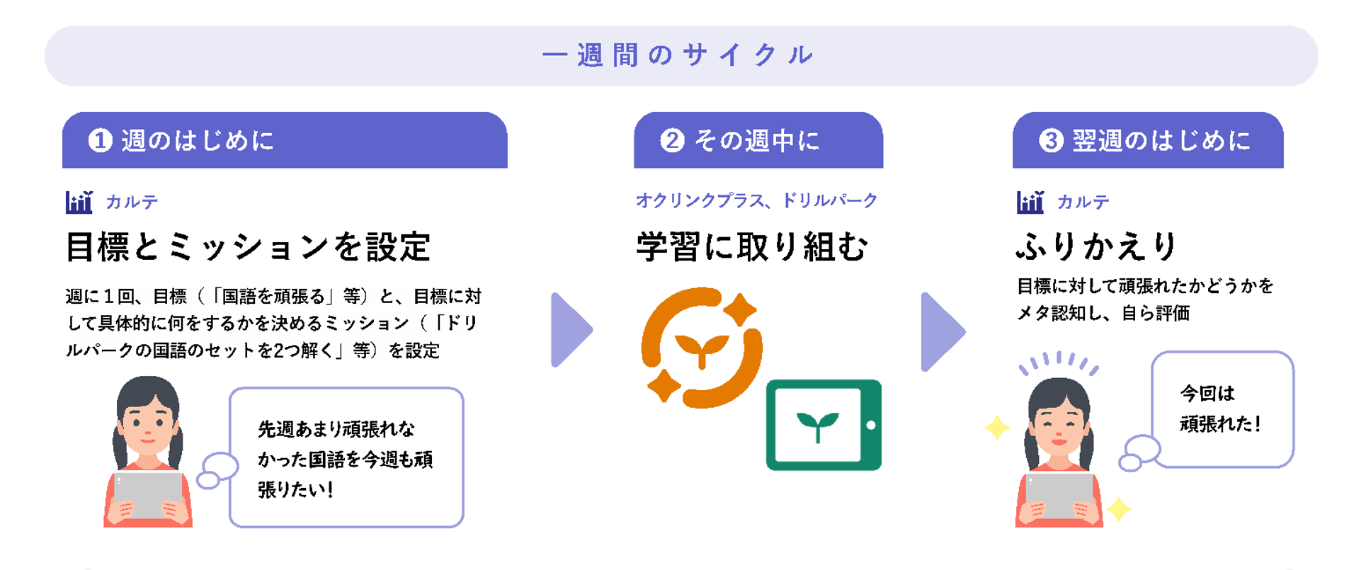 [子ども用カルテ]では、1週間を1サイクルとして、自分で決めた目標を意識して学習に取り組むことで、自然と自己調整学習にもつながります。