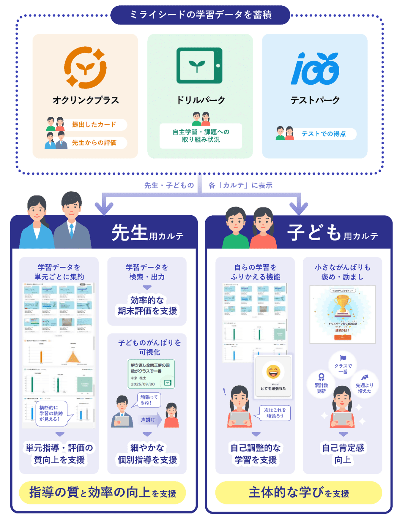 ミライシードから生み出される多様な学習データを蓄積して、子どもの学習状況を的確に見取ることができます。