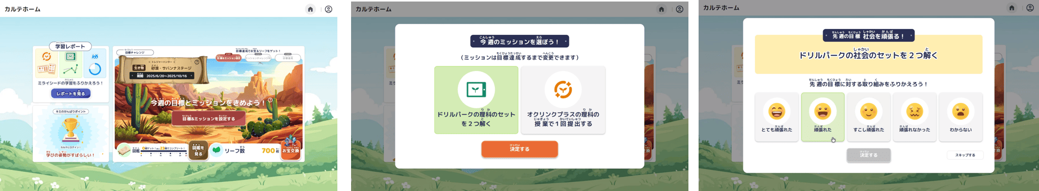 ゲーム要素を取り入れつつ、子どもの学びへの動機づけを促進し、学習サイクル定着へ。子どもたちがカルテを使って1週間の学習の目標とミッションを決定。目標の達成を目指して各アプリでの学びをすすめ、翌週のはじめに前週の学びをふりかえります。