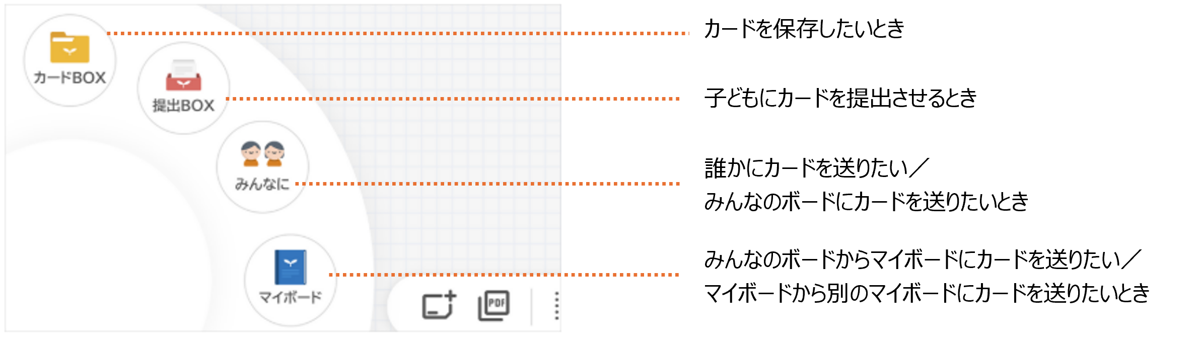 一人ひとりが「カード」を作成し、自分のアイデアや考えをアウトプットできます。多様な表現アイテムで、子どもの自由な表現をサポートします。