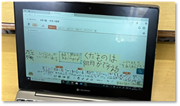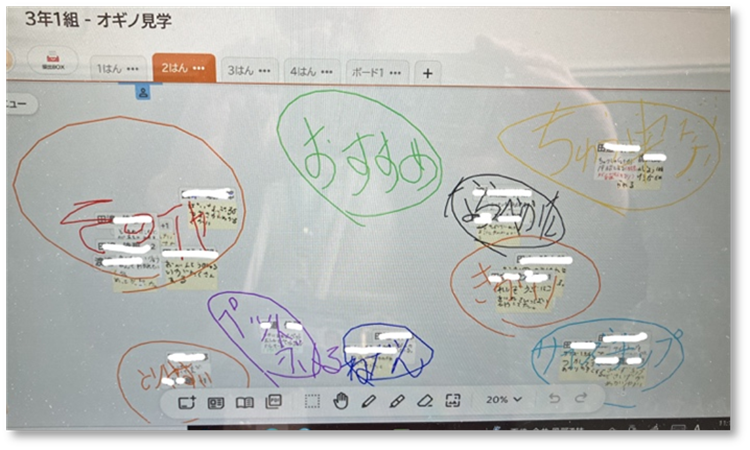 まとめたカードを「みんなのボード」の自分の班のボードに送る。班ごとに子ども同士で話し合いながら、「みんなのボード」上で仲間分け(カテゴリ分け)をしていく。