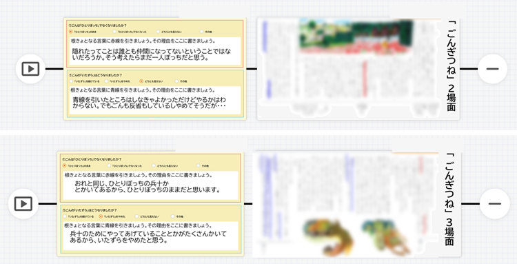 具体的には、物語の設定を押さえ、その設定に書かれている「ごんはひとりぼっちのままか」「ごんはいたずらをし続けるのか」という2つの視点で、情報を整理しながら物語を読んでいく。