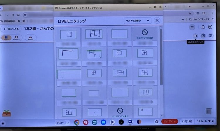 小学校1年生ということもあってタイピング入力は難しいのですが、今回はそれを逆手に取ってオクリンクプラス上に漢字を「書いて覚える」学習を行いました。紙で漢字の学習をするとそれぞれの児童がどのように活動をしているのかを一斉に見ることはできないのですが、オクリンクプラスには「ライブモニタリング機能」があり、それを使うことでそれぞれの児童がどのような状況なのかが分かってとても助かりました。