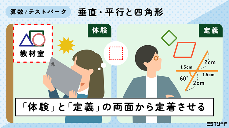 「垂直・平行と四角形」の単元で学んできた内容の定着度合いを確認し、定着が弱いところをフォローする