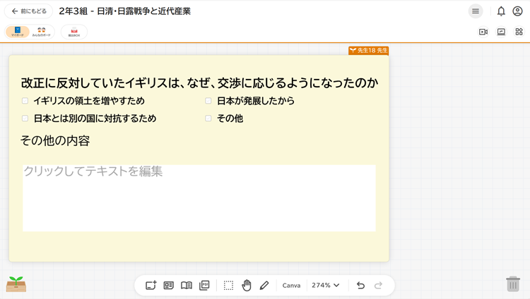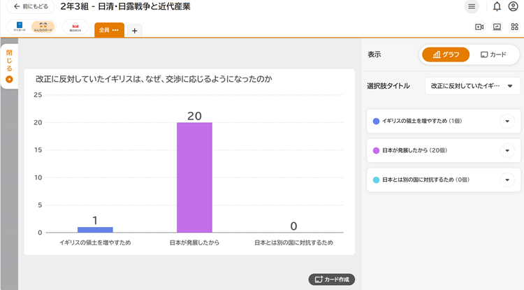 前時までの学習内容を振り返る穴埋めプリントに取り組ませた後、オクリンクプラスを用いて本時の授業テーマ「不平等条約の改正に反対していたイギリスは、なぜ交渉に応じたのか」を提示した。教員はあらかじめ「みんなのボード」にイギリスが交渉に応じた理由として想定される三つの選択肢を「選択肢集計機能」を使って記したカードを配置し、生徒はその中から自らの考えに最も近いものを選択した。