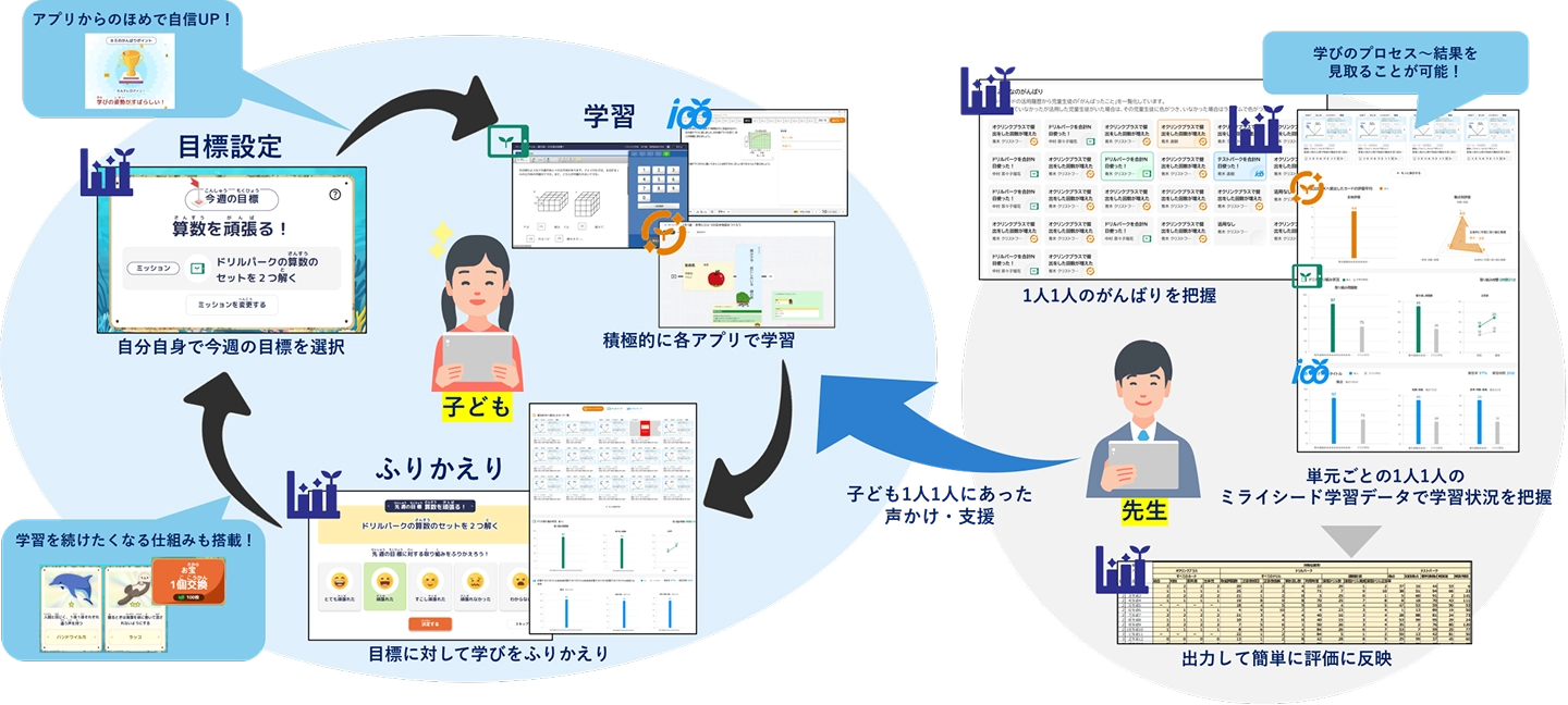 子どもの「目標設定→学習→ふりかえり」の学びのサイクルを自然に支えながら、先生がそのがんばりを確かな指導・評価につなげられるように支援します。