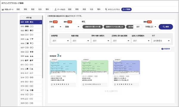 オクリンクプラスで提出したカードを、条件に合わせて自在に表示切替。ニーズに合わせて効果的にカードを整理・活用できます。※教科が設定され、提出BOXに提出された全教科のカードが対象になります