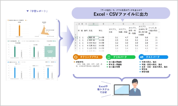 単元別学習レポートのデータは、ExcelやCSV形式で出力可能。他の評価材とも合わせて評価にもご活用いただけます。