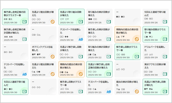 クラスの児童生徒一人ひとりのミライシードでのがんばりを、様々な観点で表示。個別の声掛けに生かせます。